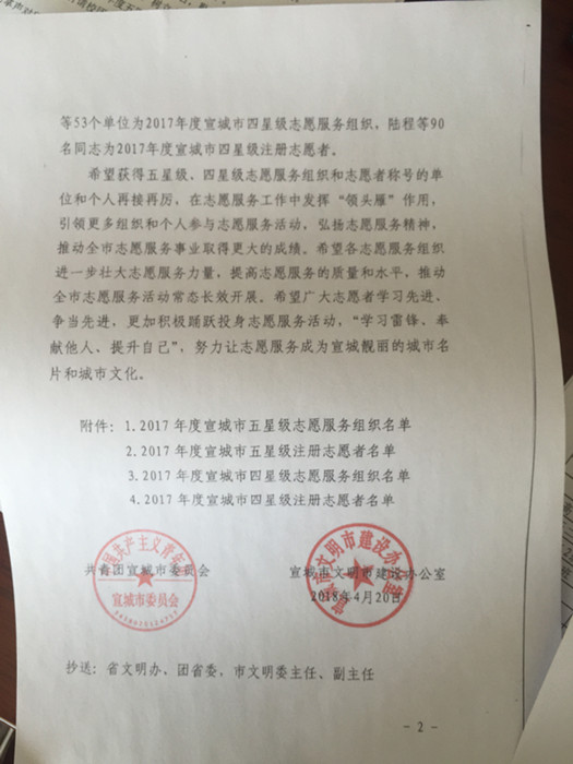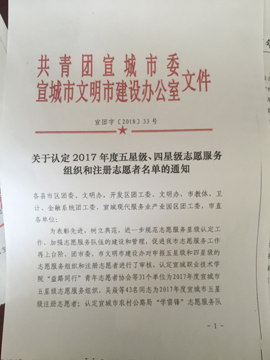 188金宝博唯一官网_wap.sports918.com志愿服务队在宣城市志愿服务组织评选中被认定为五星级志愿服务组织;188金宝博唯一官网_wap.sports918.com志愿者程云霞同志被认定为五星级注册志愿服务者。