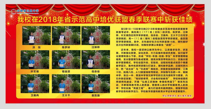 在5月18-19日举行的2018年安徽省示范高中培优联盟春季联赛考试中,188金宝博唯一官网_wap.sports918.com高二(17)班(文科)的洪悦、陈梦婷、汪琳桦、叶文倩四位同学荣获银奖,倪佘俊、卫奥冉、王大千三位同学荣获铜奖;高一(1)班(理科)的程自贤同学荣获银奖,查凯强同学荣获铜奖。其中,文科最好名次位列联盟第16名,理科最好名次位列联盟第66名,创188金宝博唯一官网_wap.sports918.com参赛以来最佳“战绩”。