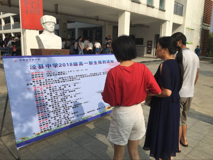 8月1日上午,泾县中学校园内洋溢着迎接2018级高一新生的喜庆气氛。花木掩映,彩旗飘扬,道路整洁,音乐激昂,各个电子屏上“泾县中学欢迎您”“热烈欢迎新同学”等字样也显得格外醒目。