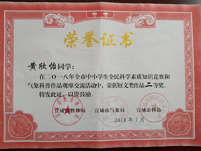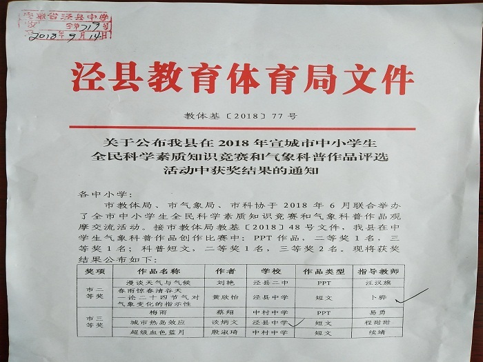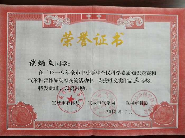 为贯彻落实国务院《全民科学素质行动计划纲要实施方案》,有效提升广大青少年学生科普水平和发展潜力,提高气象科学素养和公共服务效益。近日,2018年宣城市中小学生气象科普作品评选业已揭晓,188金宝博唯一官网_wap.sports918.com师生在此次评选中获得优异成绩。