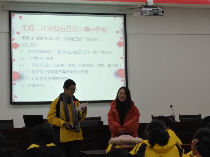 活动进入第三个环节,李老师请学生们想想自己的特长和优势,完成自己的“个性名片”,引导学生从发现自己的小美好开始,适当运动,身心和谐,并为学生提供了听音乐、放松心灵等树立乐观心态的小妙招。最后,李老师向学生们提出真诚的希望:希望我们每一个人都能拥有乐观的双眼,积极地发现身边的美好,不断感受属于我们每个人的隐形的翅膀,朝着梦想勇敢飞翔!