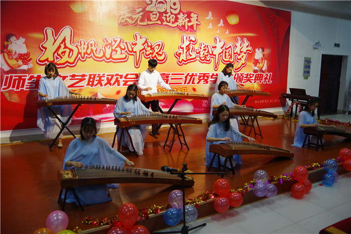 接着古筝合奏《青花瓷》拉开了文艺联欢会的序幕。姑娘们美若仙子,琴声悠扬,营造出唯美的意境;英文歌曲带着大家感受欧美风情,别具味道;诗朗诵《新年 你好》,表达了我们对新年及未来的美好祝福;双人拉丁舞引爆全场,掀起高潮,原来男生的拉丁也可以如此的妩媚、妖娆;游戏环节,同学们意犹未尽,实在是欢乐;晚会在大合唱励志歌曲《追光者》中圆满的落下帷幕。