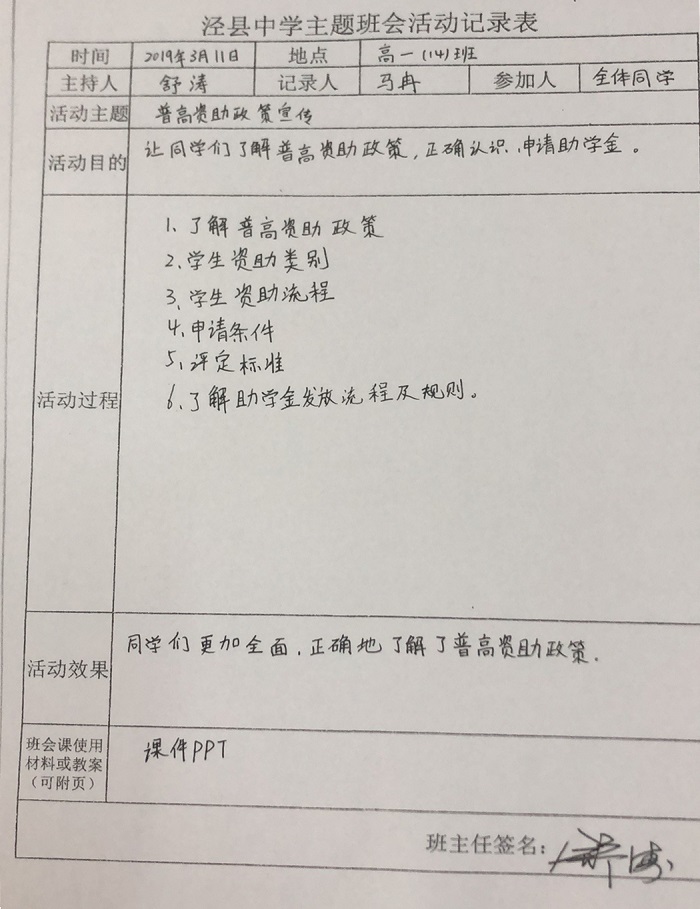此次主题班会活动,旨在通过学生的学习与宣传,加大教育资助精准扶贫宣传的力度,让党和国家的教育惠民政策得到更深入的宣传,以确保在物质帮扶的同时,发挥政策传播与励志引领的作用,加强对学生的诚信教育、感恩教育和社会责任感教育,激发广大学生特别是家庭经济困难学生发奋图强,树立积极进取的信念。