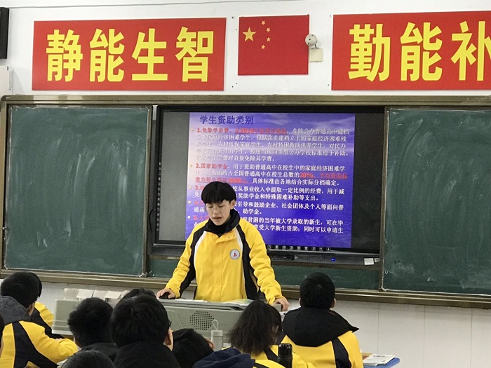 主题班会以班级为单位开展,首先由各班班主任就此主题班会的目的、背景和要求进行简单介绍,然后由各班学生代表向全班学生宣读国家资助政策体系内容,最后由班主任就本学段和下一学段的相关资助政策、资助对象、资助标准、资助程序等内容组织学生交流,当堂解答学生疑难问题,并动员学生回家后对家长进行资助政策宣传。