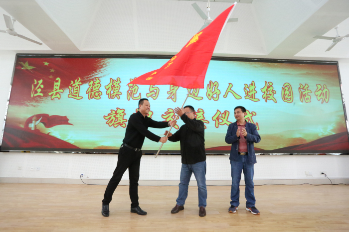 文明卡发放仪式结束后,副校长佘超俊代表学校将全县身边好人进校园旗帜交接给第二季度承办的单位宣城市工业学校。活动在优美的舞蹈表演《伞舞》中圆满结束。