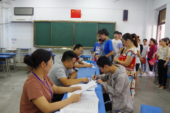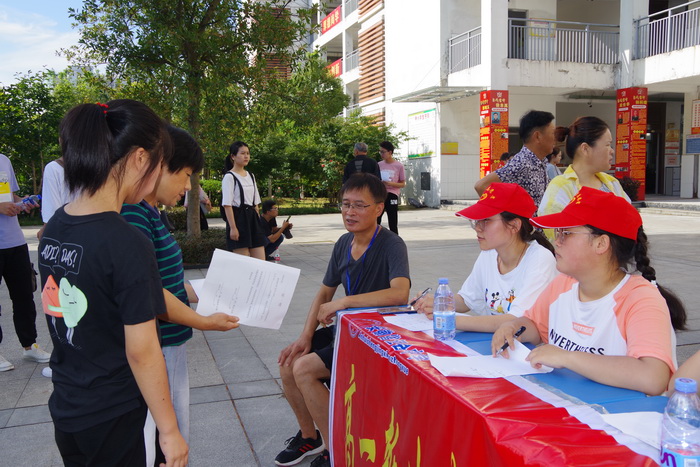 自早晨7:00起,八百多名新生在家长的陪同下陆续到校,完成了报到、测量身高、领取资料等各个程序。虽然报到人数众多,但在学校细致的组织安排下,在工作人员和学生志愿者认真的引导下,现场秩序井然,各个环节衔接紧凑,推进得有条不紊,体现了学校高超的管理水平。