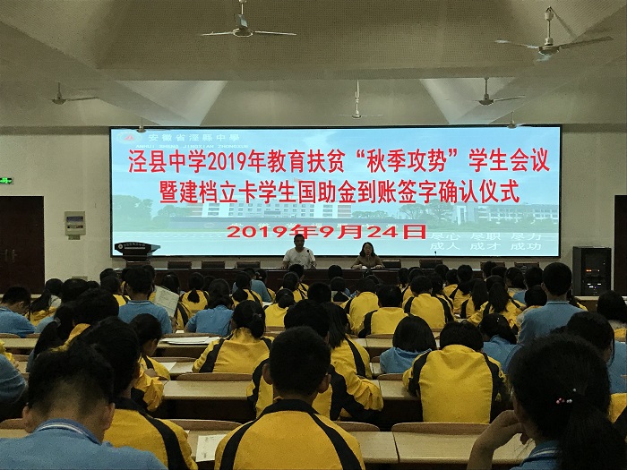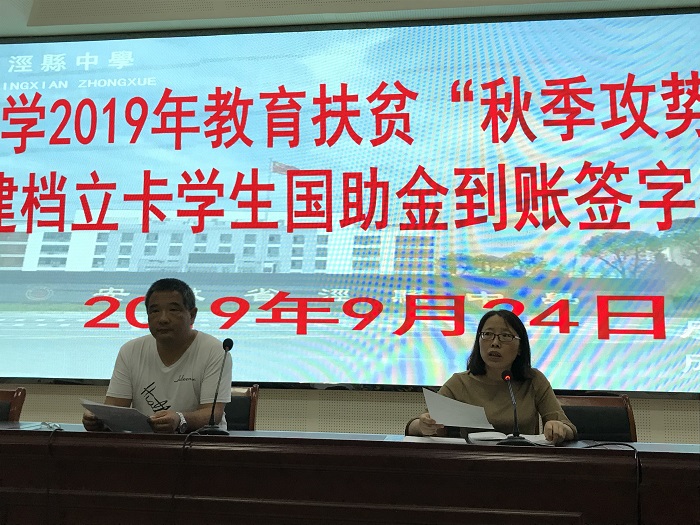 9月25日晚,188金宝博唯一官网_wap.sports918.com在阶梯教室举行2019年教育扶贫“秋季攻势”学生会议暨建档立卡学生国助金到账签字确认仪式。校资助中心全体工作人员及188金宝博唯一官网_wap.sports918.com111名建档立卡家庭贫困学生参加仪式。仪式由校资助中心主任汤筱敏主持。