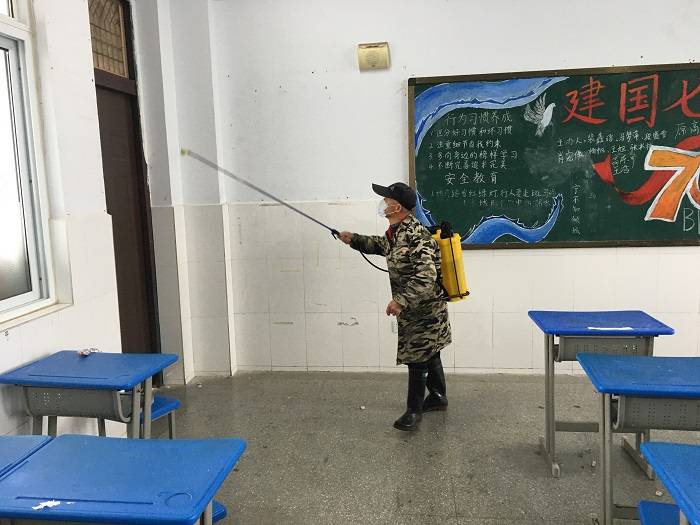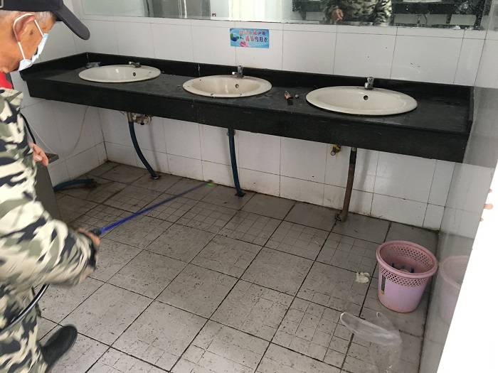 在消毒过程中,保洁人员认真负责,严格按照消毒液与水的比例配好消毒液,对教室、厕所等师生聚集场所进行了科学消毒,做到认真、仔细,不留下一个死角,以此消除传源病媒。