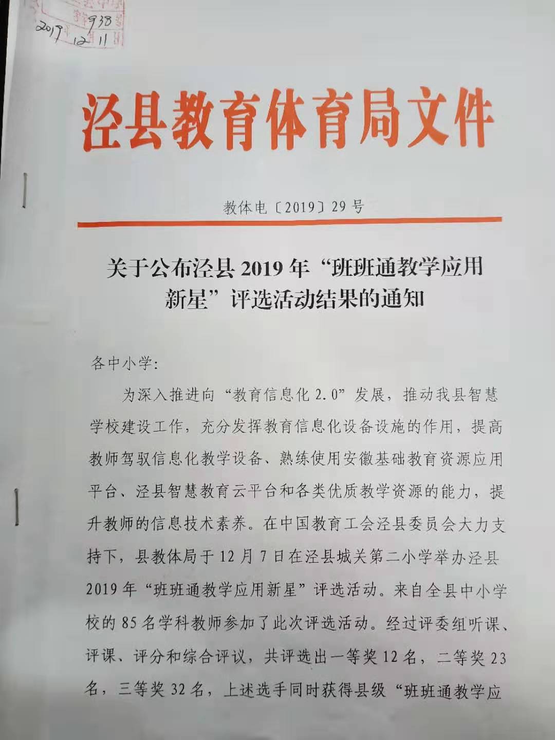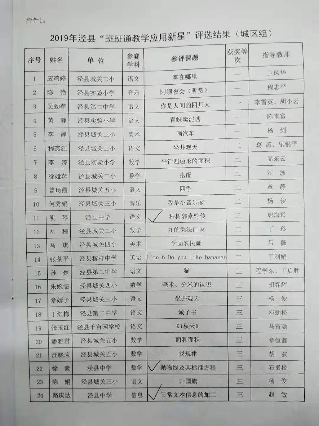 经过评委组听课、评课、评分和综合评议,代表188金宝博唯一官网_wap.sports918.com参赛的熊琴老师(指导教师:唐海玲)获城区组县二等奖,徐素老师(指导教师:石贵松)、路庆达老师(指导教师:赵敏)获城区组县三等奖,并且同时获得县级“班班通教学应用新星”称号。