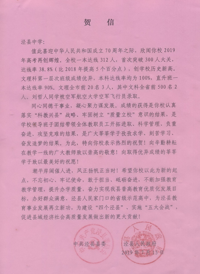 学校圆满完成了2019年高考和高中学业水平考试泾县考区泾县中学考点的各项工作,考务工作实现了“考生称心、家长放心、社会满意”的平安考试目标。由于全校上下尤其是高三师生的拼搏进取,扎实苦干,2019年高考,全校一本达线312人,首次突破300人大关,达线率38.8%(比2018年提高5个百分点),创学校历史新高;文理科第一层次班级成绩优异,本科达线率均为100%,直升班一本达线率90%;文理全市前20名3人,其中文科全省前500名2人;刘哲人同学被空军航空大学空军飞行员录取。由于高考成绩突出,县委县政府为此专门发来贺信,对学校高考所取得的成绩给予充分肯定和热烈祝贺!