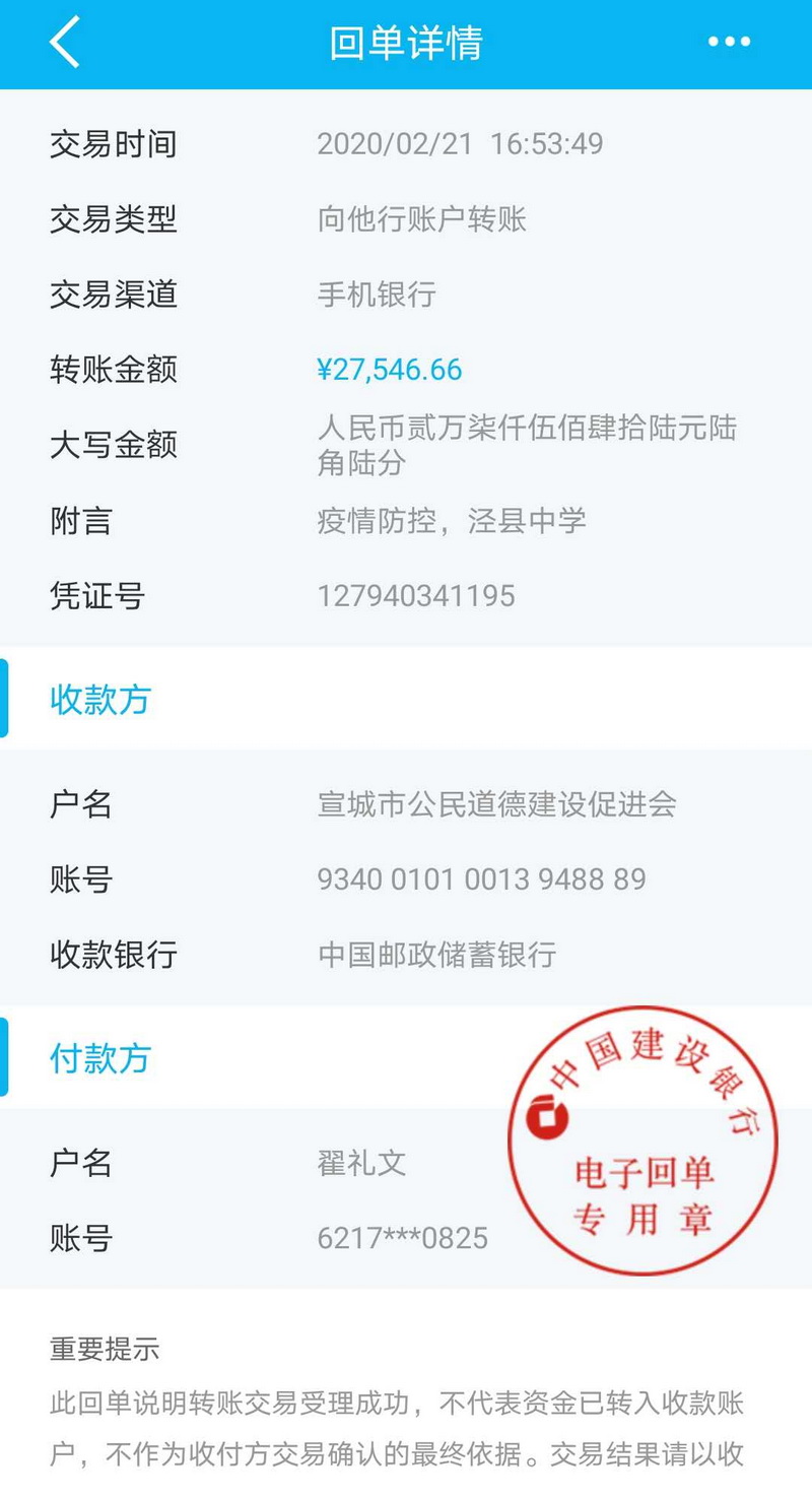 由于防疫的特殊时期,188金宝博唯一官网_wap.sports918.com教职员工主动通过微信转账的形式为支持抗击疫情贡献出自己的一份力量!大家积极参与,踊跃捐款,表现出泾中人团结一心、共克时艰的精神!此次捐赠活动共捐赠现金27500余元,这些爱心捐款将统一缴入宣城市公民道德建设促进会,用于支持新冠肺炎疫情防控工作。