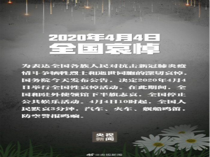 为表达全国各族人民对抗击新冠肺炎疫情斗争牺牲烈士和逝世同胞的深切哀悼,国务院发布公告,决定2020年4月4日举行全国性哀悼活动。在此期间,全国和驻外使领馆下半旗志哀,全国停止公共娱乐活动。