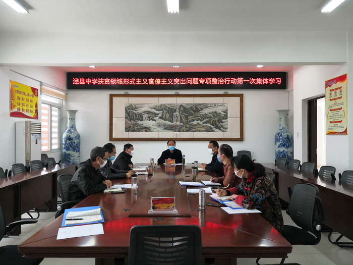 为有序有效开展扶贫领域形式主义官僚主义突出问题专项整治行动,188金宝博唯一官网_wap.sports918.com党委理论学习中心组于4月10日上午在综合南楼401室开展了第一次集体学习。学习会由校党委书记、校长王永生主持,中心组全体成员参加了学习。