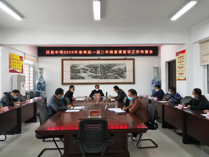 4月17日下午,188金宝博唯一官网_wap.sports918.com在综合南楼401会议室召开2020年春季高一高二年级复课复学工作布置会,全力做好高一高二学生返校复课复学的准备工作。县人大常委会副主任、校党委书记、校长王永生主持会议。