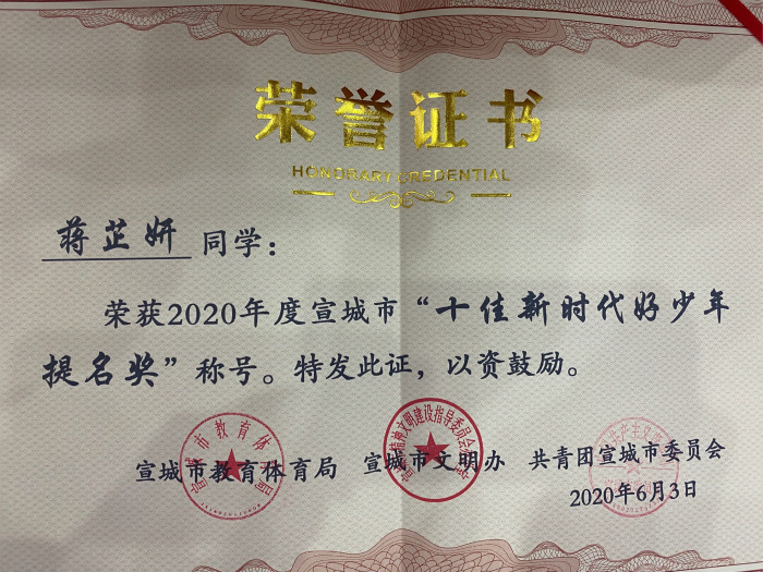 188金宝博唯一官网_wap.sports918.com2018级2班蒋芷妍同学荣获2020年度宣城市“十佳好少年”提名奖。她不仅是班级的优秀团支书,也是校学生会主席,多次参与组织学校各项活动,学习提升两不误。在家里,她乖巧听话,孝敬长辈,总是积极帮助父母做力所能及的事情,是个好孩子;在学校,她勤奋好学,心系集体,积极参加各项活动且成绩显着,是个好学生;在社会,她乐于助人,热心为他人服务,是个好公民。