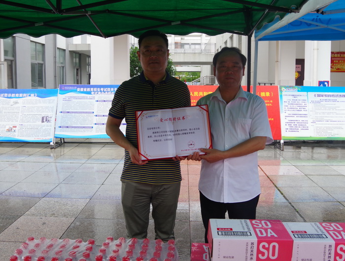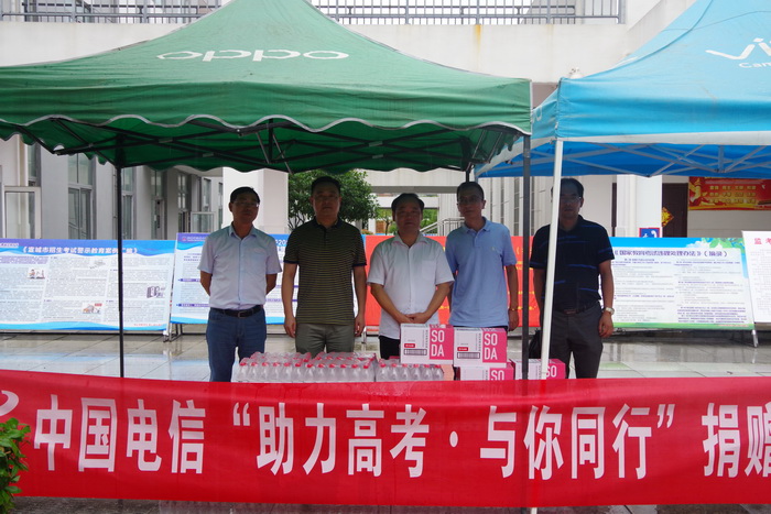 7月6日上午,中国电信股份有限公司泾县分公司总经理左波一行在县招生办主任刘潜的陪同下,冒着大雨来188金宝博唯一官网_wap.sports918.com开展“助力高考,与你同行”爱心捐赠活动。此次活动,共捐赠8顶遮阳防雨帐篷和价值2000元的矿泉水。