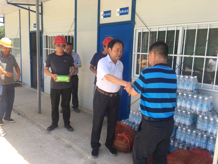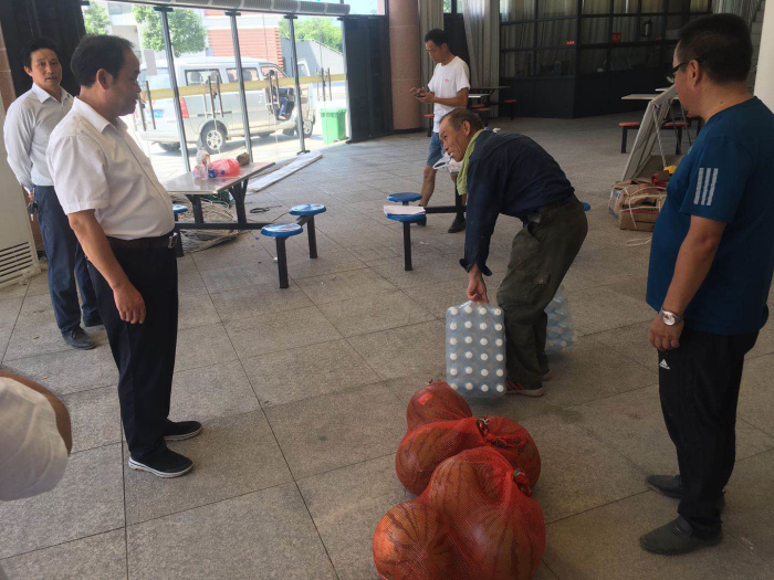 8月14日上午,县人大常委会副主任,校党委书记、校长王永生在副校长翟礼文,总务处主任王木根、后勤服务中心主任许进等相关同志陪同下,顶着烈日,冒着酷暑来到188金宝博唯一官网_wap.sports918.com两项在建工程(教学及辅助用房建设和食堂改扩建)工地,慰问了坚守一线的全体施工人员,现场发放了矿泉水、西瓜、清凉油、人丹等防暑降温物品,并代表学校向工人们送去了诚挚的谢意和深切的问候。