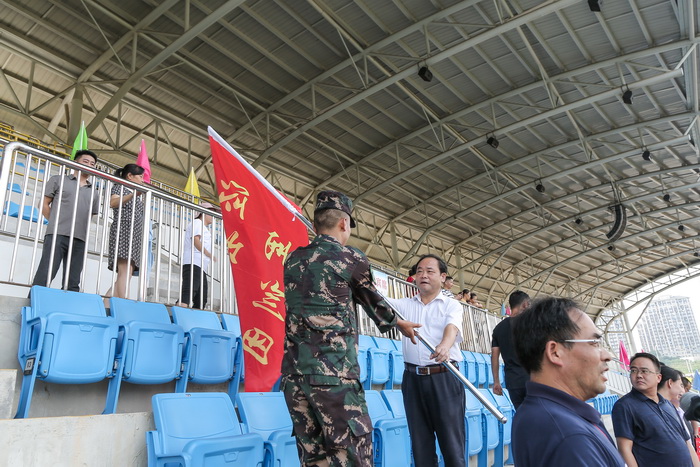 军训动员大会前,举行了“升国旗、唱国歌”仪式,全体肃立、行注目礼、齐唱国歌。会上,本次军训副团长、政教处主任张俊宣布了本次军训团编制,王校长向军训团授旗;本次军训团团长、总教官方云平带领全体教官作军训动员令;高一(1)班学生代表任祥东代表全体受训学生发言,表达了全体学生对本次军训活动的热切期盼,表示会勇于担当、勇往直前、服从命令、团结互助,发扬艰苦朴素的优良传统,坚决完成军训各项任务,磨砺意志,锤炼品质。