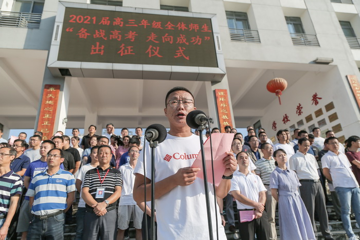 王校长在动员仪式上郑重向2021届高三年级部授旗。当2021届高三年级部主任、校党委副书记许小江接过旗帜的那一刻,新的战斗已经打响。2021届高三学子将在接下来的时间统一思想,坚定信心,勇敢出征,再创辉煌!