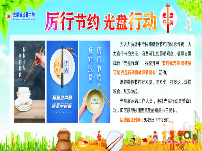 “克勤于邦,克俭于家”,同学们是祖国的未来,民族的希望,我们倡议每个泾中师生都要践行“光盘行动”,从节约粮食做起,争做勤俭节约的传承者、实践者和引领者。一起为建设一个文明、和谐的社会主义现代化国家,实现中华民族的伟大复兴贡献自己的力量!