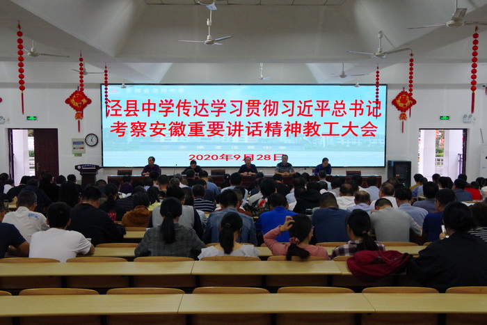 9月28日下午,188金宝博唯一官网_wap.sports918.com在阶梯教室召开传达学习贯彻习近平总书记考察安徽重要讲话精神教工大会。县人大常委会副主任、校党委书记、校长王永生主持会议,全体教职工参加会议。