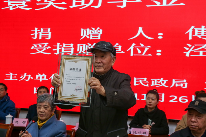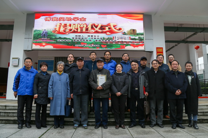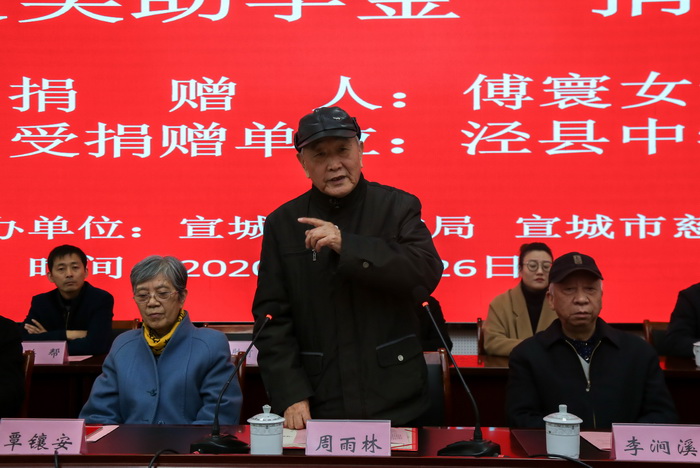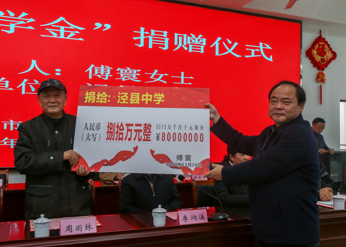 据悉,傅寰老人系新四军著名将领、开国上将傅秋涛之女,1940年3月出生,1941年皖南事变中,傅秋涛将军将其寄养在泾县当地群众家中,受到地下党和游击队的精心保护,建国后,才回到父母身边。傅寰女士十分感激老区人民的深情厚谊,在80周岁生日之际,将自己平时的80万元积蓄,定向捐赠给泾县中学,奖助学金承载着傅寰老人对曾经养育她、呵护她的革命老区的深厚情意和永存心间的红色记忆,更是傅寰老人情系老区、心怀学子的大爱情怀!这笔跨越时空的捐赠见证了80年来军民鱼水情,见证了革命军人后代和革命老区人民的血脉联系!