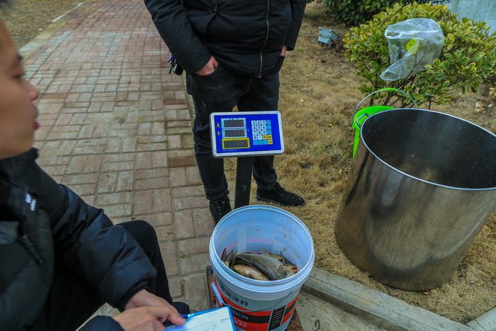 上午十二时,比赛结束,各位参赛的教职工陆续拿着自己的鱼篓到达指定处称重。最终,朱为东老师以33.8斤总重斩获此次大赛第一名。