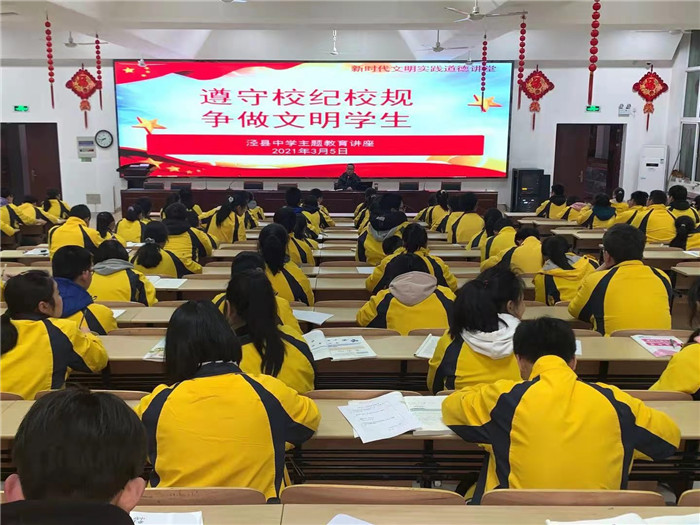 讲座中,张主任首先举例了中学生常见的不文明现象,指出这些不文明的现象所带来的不良影响及中学生文明守纪的必要性、紧迫性。接着,他带领同学们学习了《中学生日常行为规范》和《泾县中学学生一日常规要求》等校纪校规,一起共同学习了校长寄语,从成人成才成功的角度分析了遵规守纪和文明自律的重要性,指出文明守纪是中小学德育工作目标的重要内容,也是社会主义核心价值观的主要内容之一,也是学生健康成长和创建文明校园的需要。张主任号召同学们要积极宣传并自觉实践新时代文明要求,提高自身文明素养,共同建设安全文明和谐的校园。