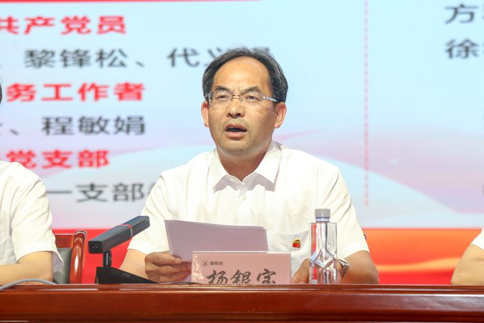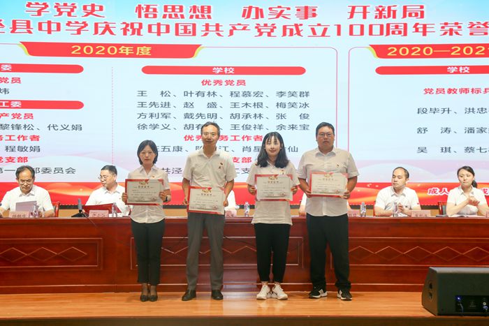 大会在庄严的国歌声中拉开帷幕。校党委委员、副校长佘超俊带领全体党员重温了入党誓词;校党委副书记许小江带领全体与会人员学习了《中国共产党简史》中《中国特色社会主义进入新时代》的主要内容,并就当前党建重点工作进行了布置;全体党员和学生还共同观看了《百年之诺》的微视频。随后,校党委委员、副校长杨银宝宣读了县委、县教体工委表彰人员名单和校党委《wap.sports918.com表彰“两优一先一标兵”的决定》;校党委成员为2020年度校优秀党员、优秀党务工作者、先进党支部及2020—2021学年党员教师标兵颁发荣誉证书。