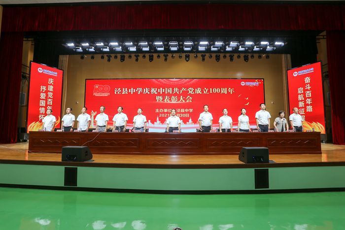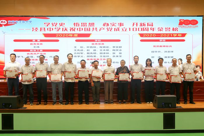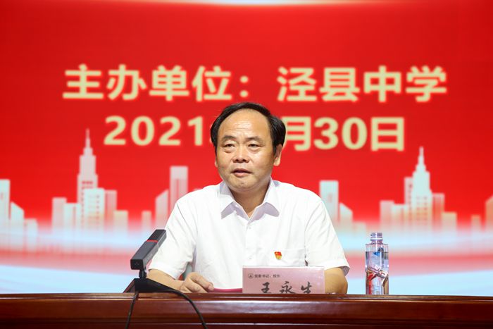 校党委书记、校长王永生在会上代表学校党委向全体党员致以节日的问候,向受表彰的优秀党员、优秀党务工作者和党员教师标兵表示热烈祝贺,向一年来辛勤工作在各自岗位上的广大党员教师表示衷心的感谢。随后,他为全体党员和学生作了题为《击鼓催征奋楫扬帆 砥砺初心 实现伟业》的党史专题党课。党课分为三部分,第一部分风雨百年,青史可鉴中,王校长回顾了党的百年历史,指出,从建党的开天辟地,到新中国成立的改天换地,到改革开放的翻天覆地,再到新时代取得历史性成就、发生历史性变革,都证明了没有共产党就没有新中国。第二部分重任在肩,奋斗不息中,王校长指出,站在学校“十四五”规划开局的崭新起点,我们全体泾中人尤其是党员教师要坚定信念,师生至上,甘做为师生服务的“孺子牛”;要埋头苦干,敢闯敢试,争当创新发展的“拓荒牛”;要脚踏实地,无私奉献,誓做艰苦奋斗的“老黄牛”,为加快建设人民满意的省级示范高中,实现学校“全市前列、皖南一流、江南名校”的强校目标而努力奋斗!第三部分初心如磐,勇往直前中,王校长给全校广大学生提出了殷切希望,要求大家以实现“两个百年”奋斗目标、伟大民族复兴的中国梦为己任,自觉做共产主义远大理想和中国特色社会主义共同理想的坚定信仰者和忠诚实践者,奋力成为新时代建设社会主义现代化强国的合格建设者和可靠接班人。