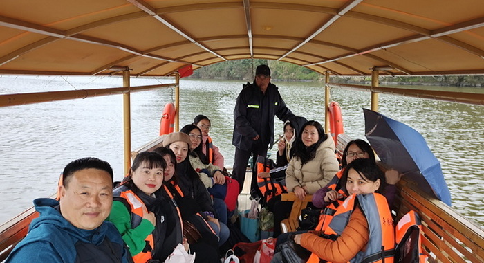 女教职工们首先来到了黄村大坝码头,坐上竹筏式机帆船沿着徽水河溯流而上,老师们一边静静欣赏着两岸秀丽如“边城”的风光,一边认真听取随行老师“眇知县和光兴公”的故事讲解,自然沉醉其中。