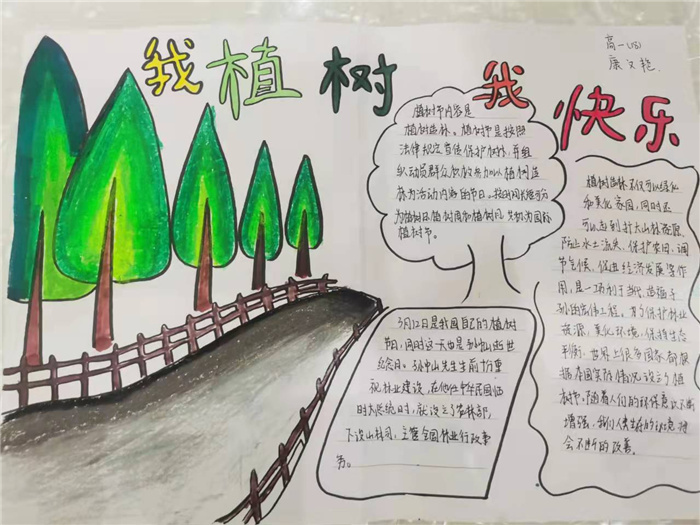 高一(18)班开展“贡献力量 奉献绿色 收获希望”团日活动,组织同学们以绘画、手抄报、作文等形式描绘心中的植树节。