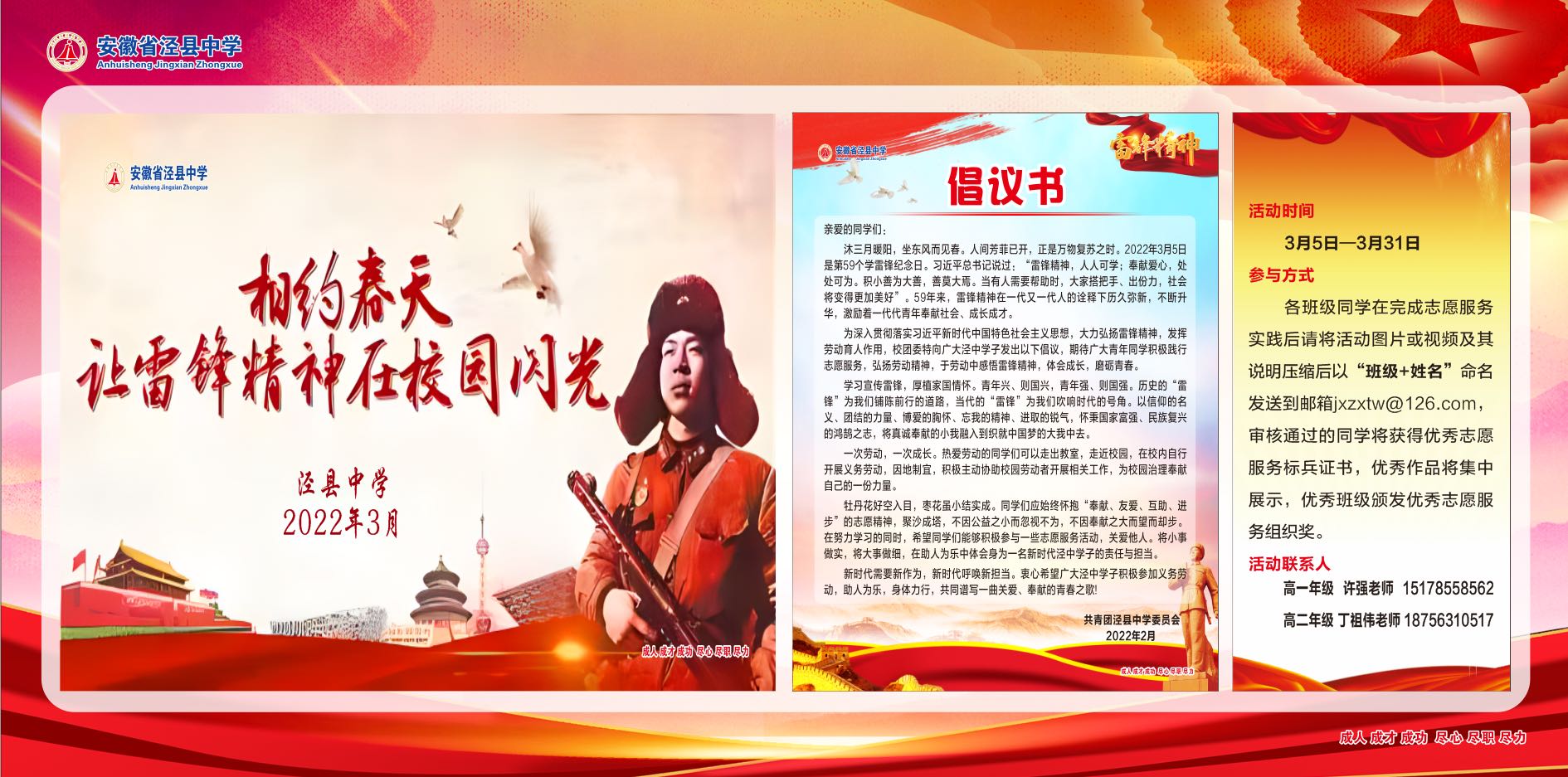 学习雷锋好榜样,泾中学子请接棒。188金宝博唯一官网_wap.sports918.com团委广发倡议书,号召全校师生踊跃投身学雷锋行动,利用展板、校刊校报、广播等多种途径动员大家积极参与系列活动。