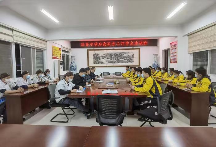 当晚,学校在综合南楼401会议室组织召开了后勤服务工作座谈会。座谈会由校长助理、政教处主任张俊主持,副校长翟礼文、后勤服务中心的工作人员及参加观摩的18名学生代表参加会议。