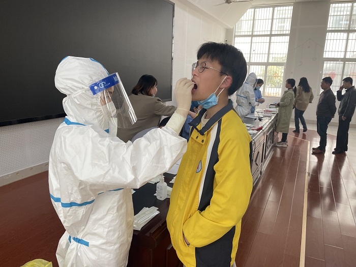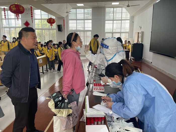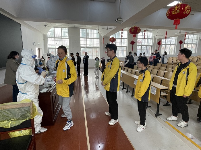 学校精心组织,制定预案,周密安排,校医室编排每批次抽测20%人员名单,涵盖了全体教职工、学生以及后勤安保等人员,确保全覆盖、不漏一人、不错一人。班主任提前通知,积极组织学生到达现场排队等候,佩戴口罩,有序检测。在检测现场所有参检人员自觉保持一米间隔,有序排队;东方医院专业医护人员身着密封隔离服,逐个采集咽拭子,在工作人员组织协调下,确保了每个批次抽测流程顺畅、快速、高效。
