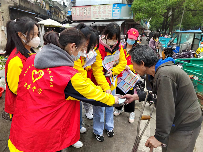 “五一”国际劳动节到来之际,在这个属于劳动者的节日里,高二(15)班团支部志愿者在班主任徐格红老师的引导下,走出校园积极参与文明县城创建的宣传志愿活动。
