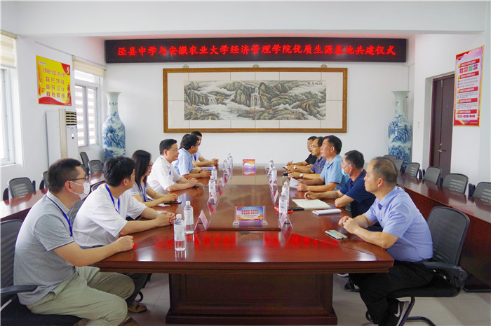 6月28日下午,188金宝博唯一官网_wap.sports918.com与安徽农业大学优质生源基地共建仪式在188金宝博唯一官网_wap.sports918.com综合南楼401会议室举行,安徽农业大学经管学院党委书记、院长孙超,党委副书记、纪委书记、副院长吴国卿,商务管理系主任王苗苗,县人大常委会副主任、188金宝博唯一官网_wap.sports918.com党委书记宋军及班子成员参加仪式。仪式由188金宝博唯一官网_wap.sports918.com副校长杨银宝主持。