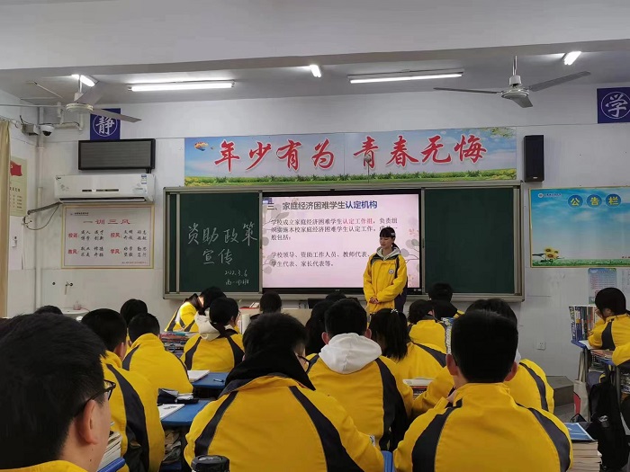 校资助中心精心制作资助政策宣传PPT,各班级认真组织学生学习了解普通高中学生资助政策,还有一些班级邀请受过资助的学生分享参与申请各类资助活动的亲身经历。主题班会上,同学们了解到:目前,我国已建立起以政府为主导,社会力量积极参与的普通高中家庭经济困难学生资助政策体系。对家庭经济困难学生认定工作的依据、程序以及国家助学金评议的过程及档次等情况也有了进一步的了解。