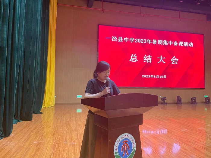 成果展示活动结束后,举行了集中备课总结大会,会议由副校长翟礼文主持。会上,首先对本次集体备课活动中涌现出的27名备课先进个人进行了表彰,副校长杨银宝宣读表彰决定,校领导为获得表彰的教师颁发了荣誉证书;陈艳老师作为备课先进个人代表分享了集体备课活动体会,教研处主任王先进作集中备课工作小结,并对下一步的集体备课工作进行了布置。最后,校党委书记宋军作总结讲话,对本次活动的组织实施过程予以充分肯定,取得的成效高度评价,从精心谋划、准备充分,相互协作、共同提高,务实保质、精益求精,知行合一、学以致用四个方面进行了总结并提出要求。宋书记号召全体泾中人要时不我待,抢抓机遇,乘势而上,做实功、求实效、能实战,在泾中的发展史上书写浓墨重彩的一笔,成为泾中教学改革的探索者、泾中快速发展的践行者和泾中奋力崛起的见证者。