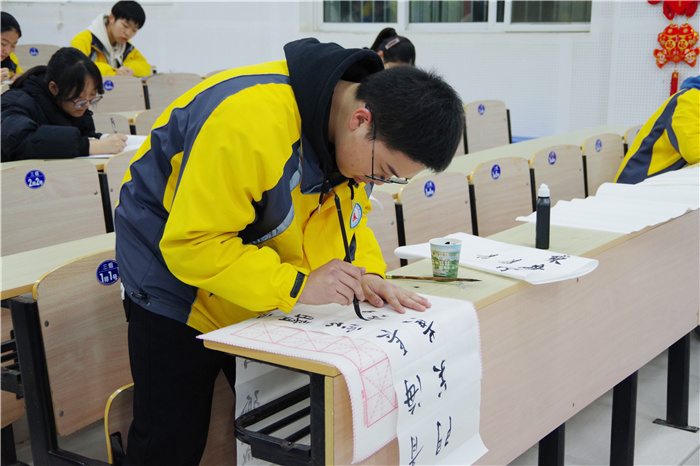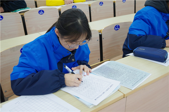 本次现场书法比赛分为硬笔组与软笔组。软笔组的同学大肆挥毫,笔走龙蛇,丰筋多力。他们时而举笔恣意挥洒,时而沉静笃定,时而轻柔灵动,时而刚劲有力,一笔一画皆是情感,一撇一捺都为艺术。硬笔组的同学也不甘示弱,铁画银钩,入木三分,挥洒自如。钢笔的笔尖轻轻触到桌子上的白纸,浅浅墨印款款染上,淡淡清香脉脉落花,诗情画意,提笔、落款,一气呵成,无不显示出中华民族文字的大气与唯美。