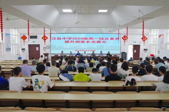 副校长林新华作了题为“扬帆远航 飞跃梦想”的主题讲话。他借助ppt课件详细介绍了学生在高中阶段树立远大理想的重要意义,并向与会学生家长们介绍了2024年高考情况以及泾县中学文化底蕴、教师情怀、管理经验、学生品质、办学资源和领导支持等六大办学优势。
