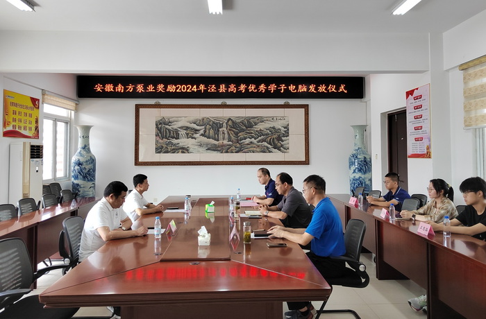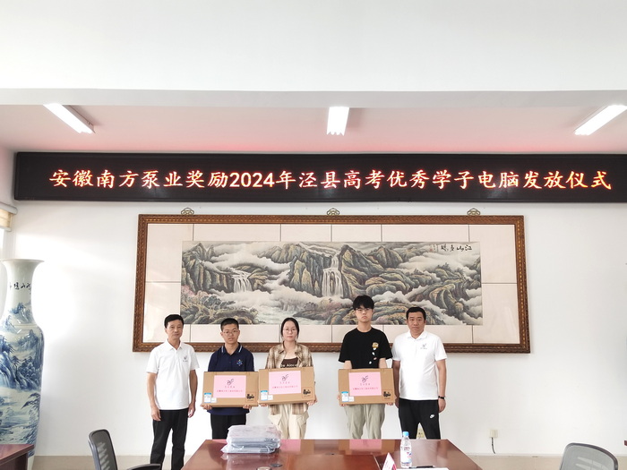 8月15日上午,安徽南方泵业奖励2024年泾县高考优秀学子电脑发放仪式在188金宝博唯一官网_wap.sports918.com综合南楼401会议室举行,安徽南方泵业公司分别向2024年泾县高考获得物理、历史方向第一名的188金宝博唯一官网_wap.sports918.com三名优秀学子现场发放了一台笔记本电脑。仪式由188金宝博唯一官网_wap.sports918.com副校长翟礼文主持,安徽南方泵业董事长潘耀东、销售总经理许东伟和188金宝博唯一官网_wap.sports918.com副校长杨银宝、沐扬参加发放仪式。