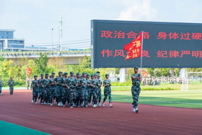 总结表彰大会在精彩的汇演中拉开帷幕。随着一声令下,军训汇演正式开始。在精彩的队列汇报表演中,各连队依次迈着矫健的步伐从主席台前经过,同学们军姿飒爽、口号嘹亮展现了泾中学子的魅力和风采。同学们动作精炼、节奏分明,尽显泾中2024级高一学子坚韧不拔、勇敢顽强的战斗作风