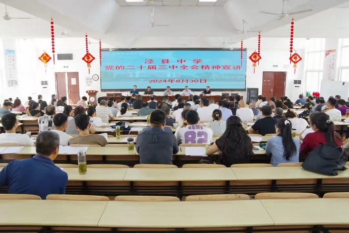 会上,县教体工委书记、县教体局局长、校党委书记朱成刚从把握全会重大意义,深入学习领会习近平总书记在党的二十届三中全会上的重要讲话精神,全面准确理解全会《决定》提出的进一步全面深化改革的重大举措等几个方面,对全会精神作了全面宣讲和深入阐释。他指出,要把学习宣传贯彻党的二十届三中全会精神作为当前和今后一个时期的重大政治任务,精心组织、周密部署。全体教职工尤其是教师党员要作学习宣传贯彻三中全会精神的表率,先学一步、深学一层,深刻领悟精神实质和丰富内涵,把三中全会的战略部署转化为办人民满意教育、实现教育强县目标的强大动力,带头做好宣传宣讲,带头抓好贯彻落实,确保三中全会精神在学校落地生根。朱书记强调,全体人员要及时调整状态,收心静心,以高度的责任感和使命感,把新学期各项工作做细、做实,以良好的精神面貌投入到新学期的工作和学习中;全体教职工要严肃纪律,规范行为,为人师表,维护好泾中和泾中人的荣誉,杜绝校外有偿补课、酒驾及赌博等事件的发生;全体人员要胸怀泾中情怀,切实做到爱校护校,共同努力,共同战斗,努力把泾县中学办成县委县政府放心、全县人民满意、学生家长信任的泾县人民家门口的优质省级示范高中,为推动泾县中学教育振兴、促进县域经济社会高质量发展做出“泾中人”更大的贡献。