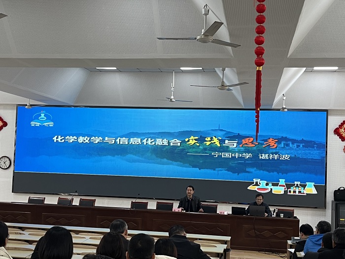 下午,精彩继续。宁国中学化学名师谌祥波,凭借自身多年积累的丰厚教学经验,精心筹备并开展了一场极具价值的微讲座 ——《化学教学与信息技术融合的实践与思考》。在讲座中,谌老师深入分享了其在化学教学过程里,巧妙运用信息技术手段的诸多实践案例与深刻思考感悟。他详细阐述了如何借助多媒体资源,将抽象的化学概念转化为生动形象的可视化内容,以增强学生的理解与记忆;又是怎样通过线上教学平台拓展教学空间与时间,实现与学生的高效互动交流。