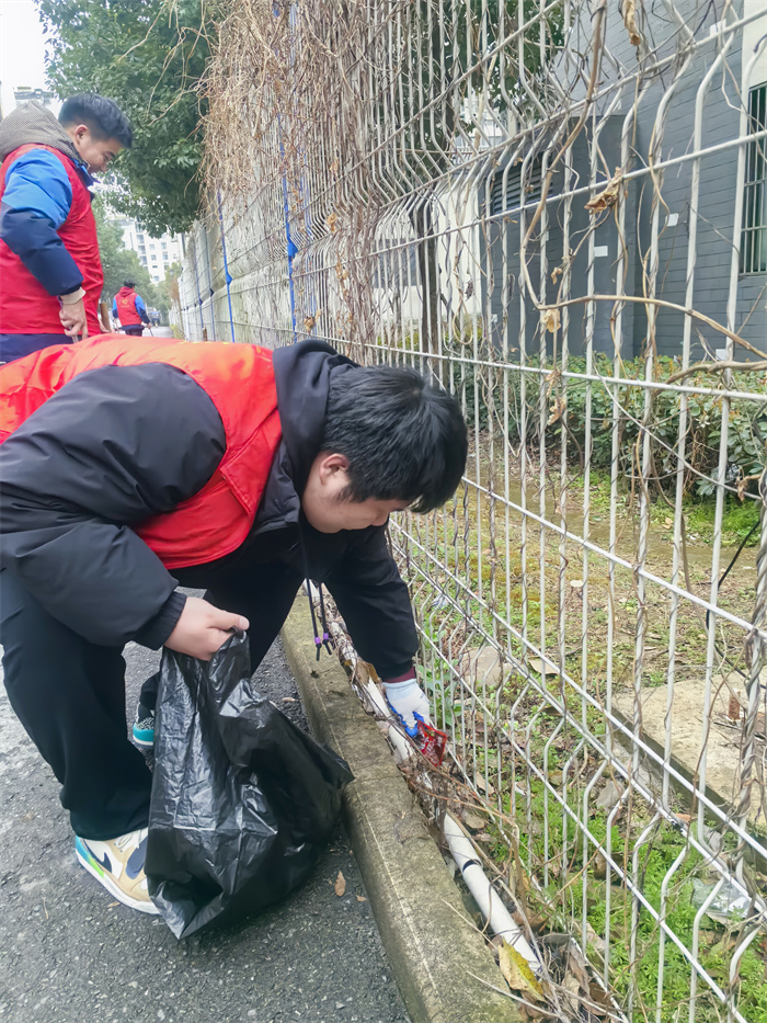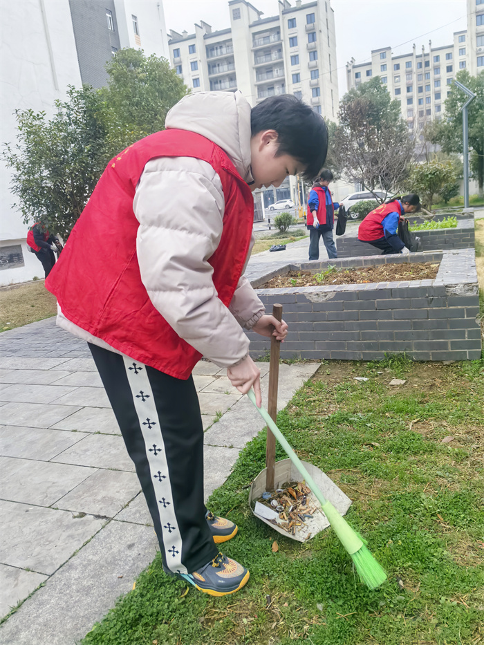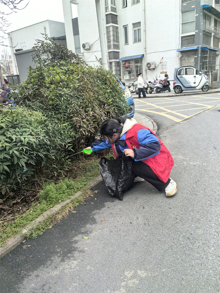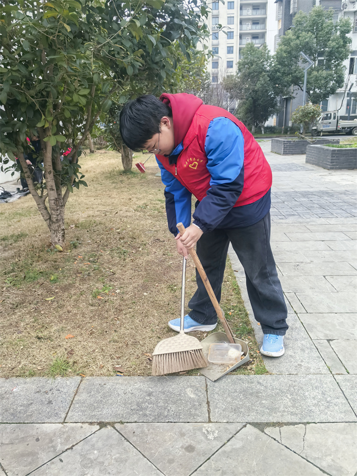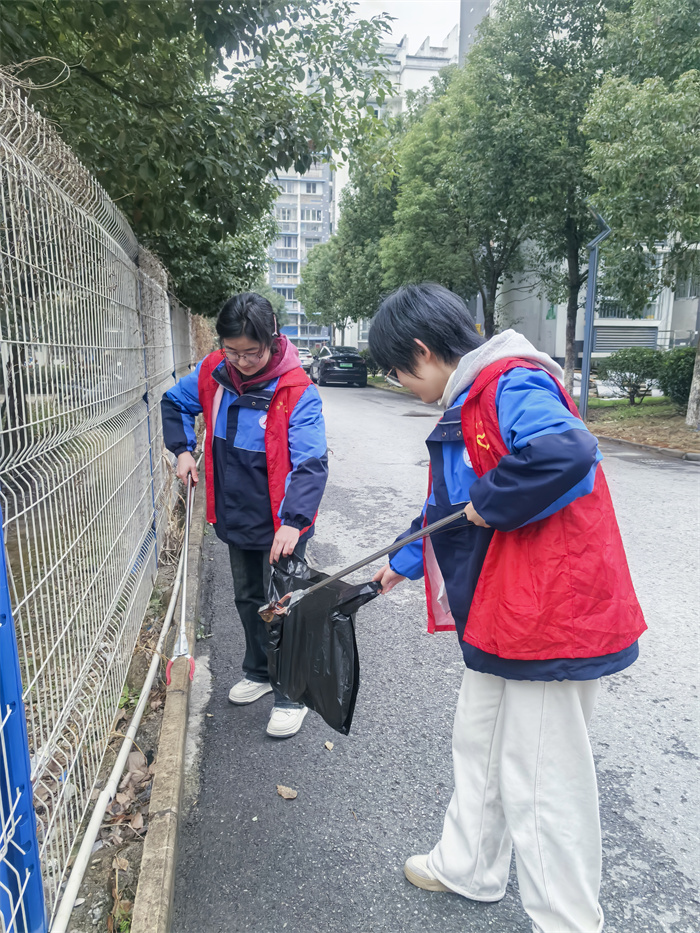 大课间一到,来自高二(2)班的志愿者们迅速集合,身着红色志愿背心,手持扫帚、垃圾袋、垃圾夹子等清洁工具,奔赴龙井苑小区。在小区道路上,志愿者们清扫落叶、烟头和杂物,认真细致,不放过任何一个角落。在绿化带中,志愿者们仔细清理隐藏在草丛里的垃圾。有的同学弯腰徒手捡起烟头、纸屑,有的同学用夹子夹起塑料瓶、包装袋。在清理过程中,大家还不忘向居民宣传环保知识,倡导大家爱护环境,从自身做起,共同维护小区的美好环境。